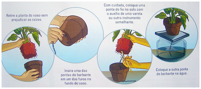 Não é sempre que dá para a vizinha ou o parente cuidar de suas flores quando você viaja. Além da velha goteira da torneira ou mangueira, uma boa alternativa, por períodos relativamente curtos, é a rega por pavio. Esta técnica consiste em utilizar um barbante ou uma fita de pano. Uma das extremidades é inserida na terra e a outra fica em um recipiente com água. A planta sugará a quantidade suficiente do líquido para ser hidratada.